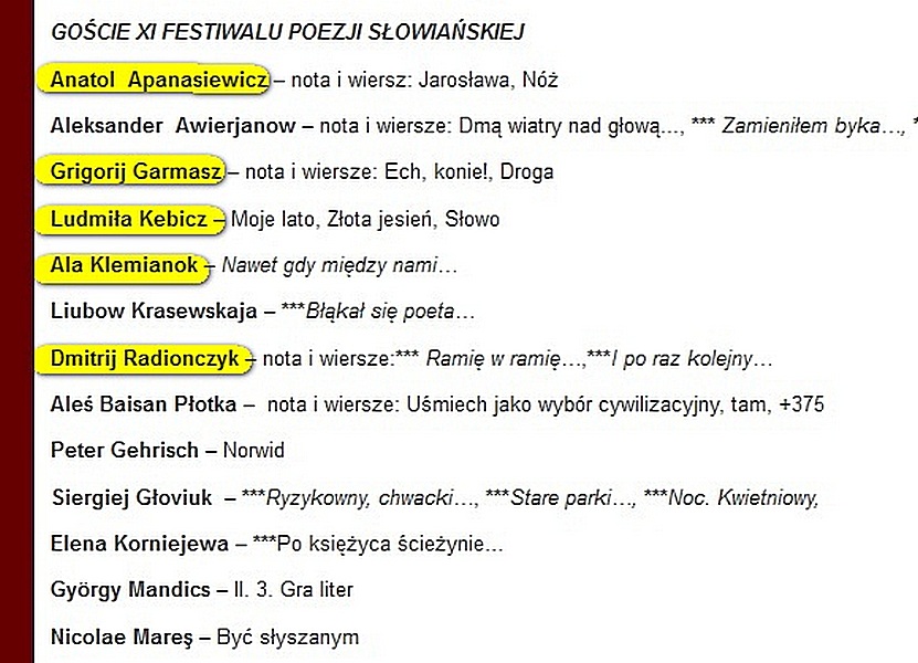 Падчас ХІ Фестывалю Славянскай паэзіі святкавалася і 20-годдзе часопіса "Poezja dzisiaj". Напярэдадні выйшаў яго чарговы нумар, у якім былі надрукаваны ў перакладзе на польскую мову творы аўтараў Гродзенская аддзялення СПБ: А.Апанасевіча, Г.Гармаша, Л.Кебіч, А.Клемянок, Д.Радзівончыка.