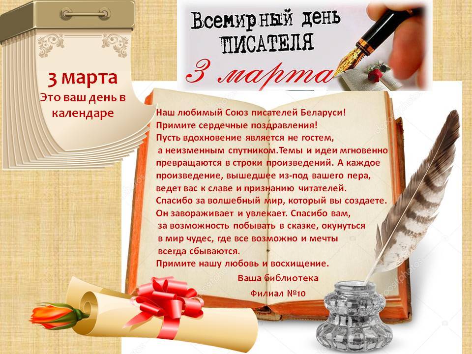 3 САКАВІКА АДЗНАЧАЕЦЦА СУСВЕТНЫ ДЗЕНЬ ПІСЬМЕННІКА. Чым даўжэй мы займаемся абранай справай, тым больш пераконваемся ў тым, што пісьменніцтва мае дачыненне не толькі і не столькі да мастацтва. Шаноўныя сябры, прыміце, калі ласка, сардэчныя віншаванні з нашым прафесійным святам: ...